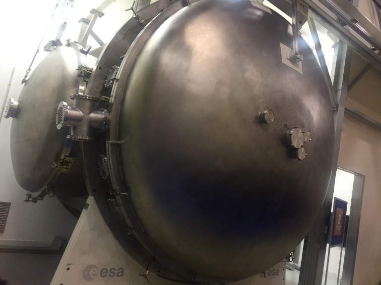 This 11.8m-long pressure chamber serves to subject all satellites to space-quality vacuum. It is also fitted with a thermal tent that can induce extremely rapid temperature shifts, to check the test satellite’s thermal resilience.