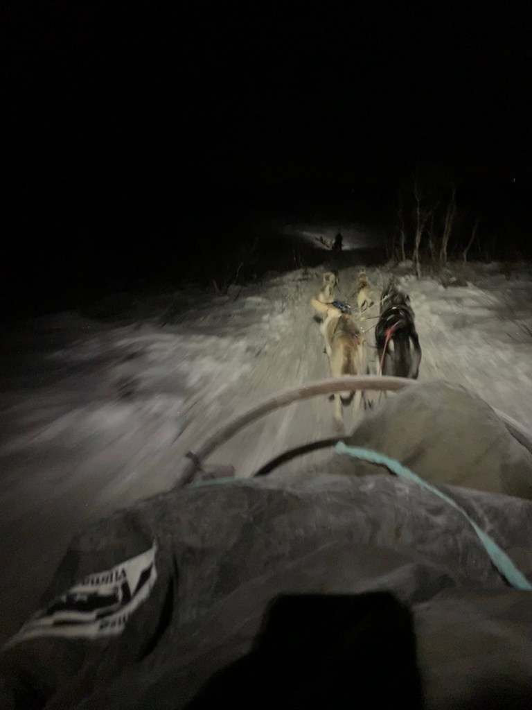 There were eight huskies attached to my sled, a female called ‘Lyn’ (Lightning) was in the lead spot to encourage the males to chase her. Guided by headlamps and Lyn’s nose, with her head held high and chest low, we raced off into the dark, snow-covered landscape to chase the Northern Lights.