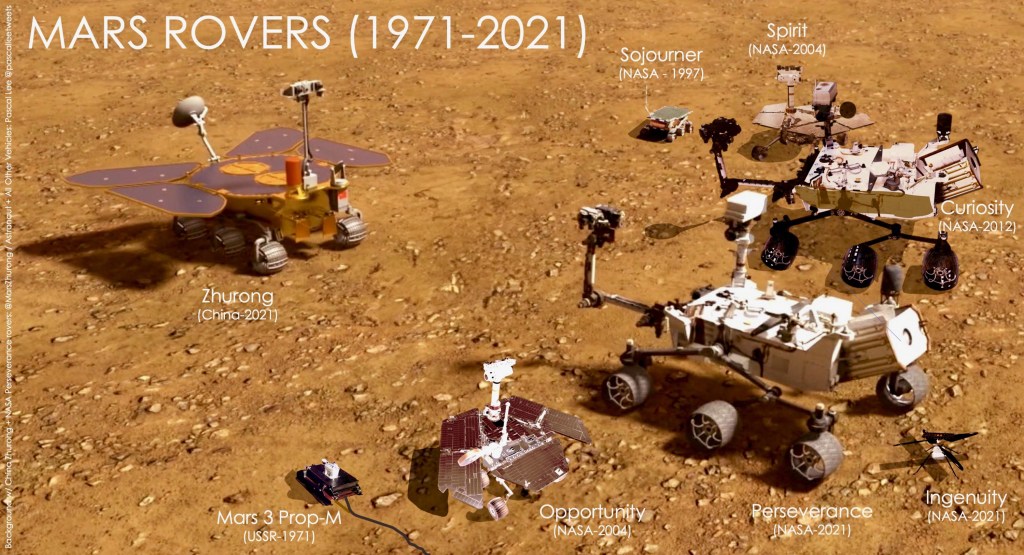 The rovers themselves are lined up in the same chronological order that they landed on the Red Planet: The Sojourner rover (1997), the twin Mars Exploration Rovers Spirit and Opportunity to (2004), the Curiosity rover (2012) and Perseverance itself. But remember this is a ‘family’ portrait.